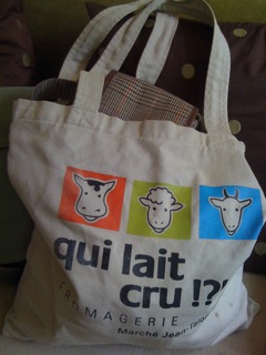 Seven years ago, I bought my first cloth shopping bag from a cheese shop in Montreal. The bag was a thick, durable-yet-soft canvas with a colorful cartoon drawing of a cow, sheep and goat on the side. The caption read, “Que lait cru!?!”, the name of the fromagerie. Since I don’t speak French, I have no idea what this phrase translates to in English, so I just tell people it means, “Who cut the cheese?”