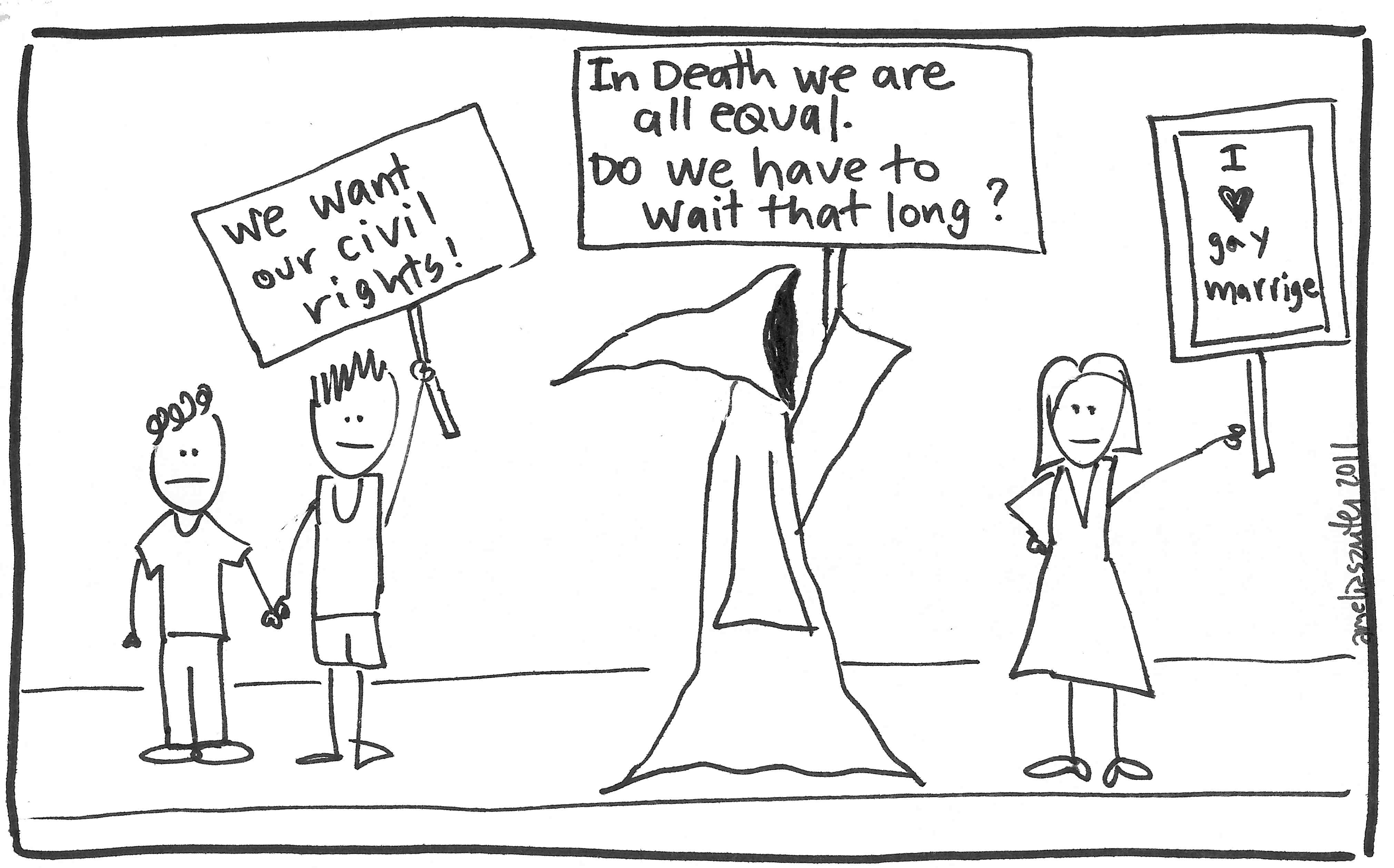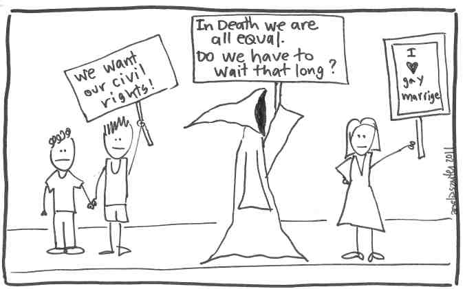 But some inequalities can be fixed, and I’m going to keep whining until I get my way. I want the right to charge a big fat wedding to my high interest credit card; to buy a fancy white dress that I wear once and then nostalgically stash in the back of the closet; to dance the Electric Slide, the Macarena, and The Chicken Dance Polka at my own cheeseball wedding; to check the “married” box on state and federal tax forms.