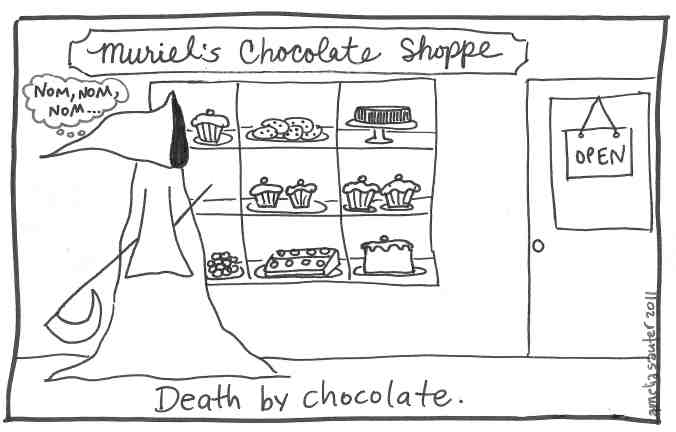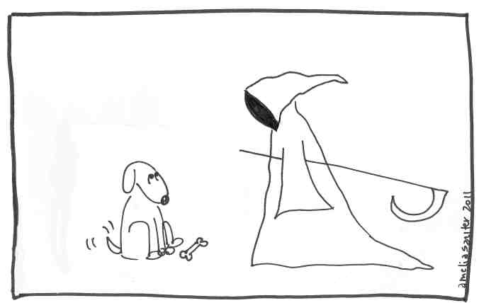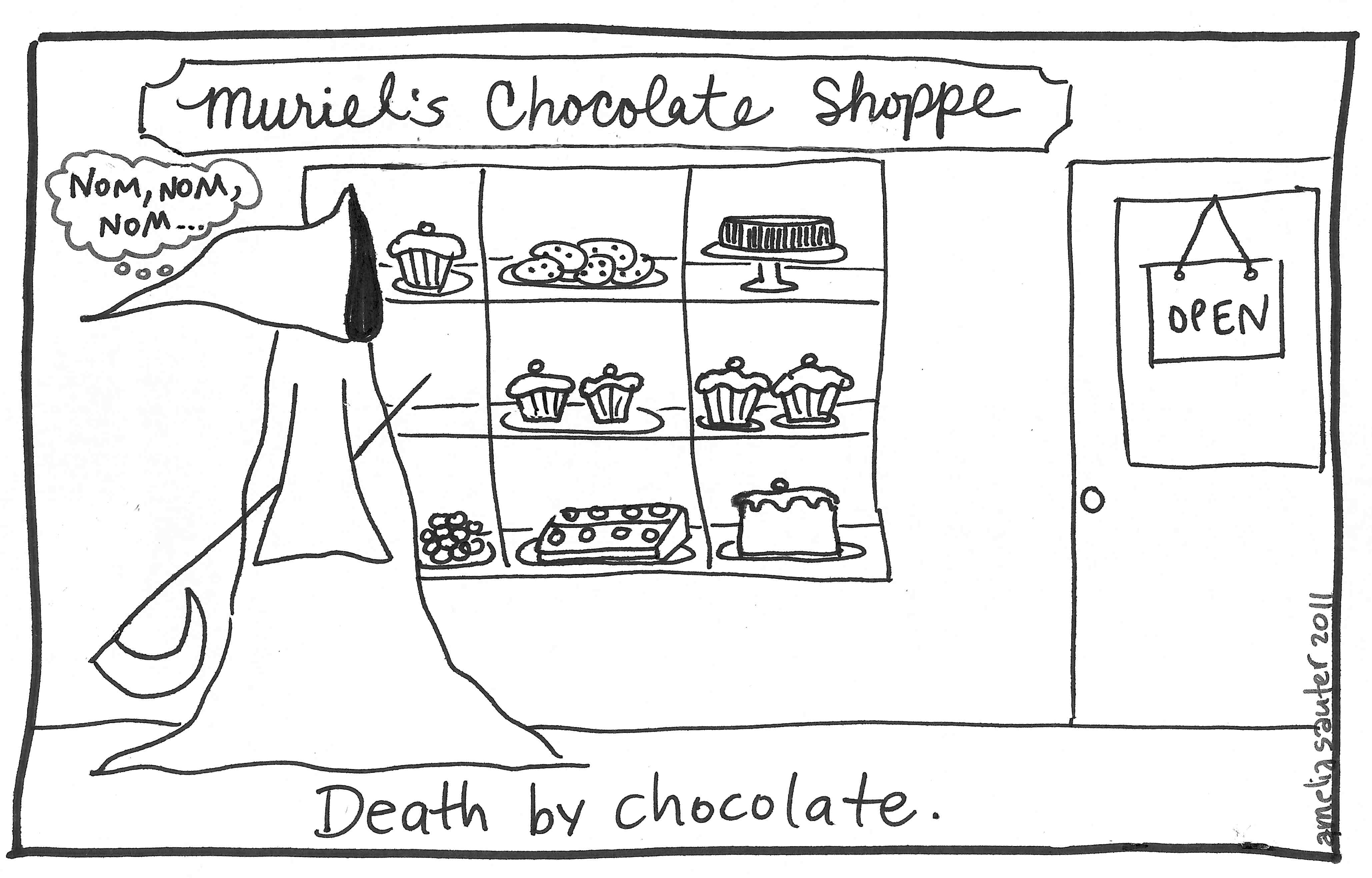WRITE YOUR OWN CAPTION! You’ve always wanted the opportunity to laugh in the presence of Death; here’s your chance. The winner will receive a limited edition A Year Full of Death Calendar 2011 filled with cartoons made by me, Amelia Sauter. I know, I know, there’s only five months left in 2011 but it’s the only merchandise I’ve created so far. And since only 20 calendars were printed, someday it could be worth a lot of money on eBay.
