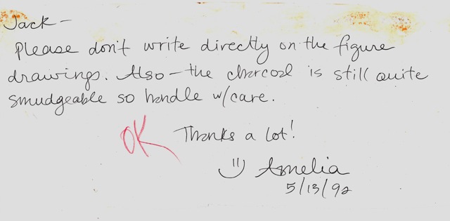 My favorite memory of Jack is the day he sat on a stool in the middle of the room, struck ‘The Thinker’ pose with his chin on his hand, and said, “Draw me.”  A few minutes later when he looked at our sketches, he leaned over my desk and muttered, “I sure as hell hope that’s not what I look like.”